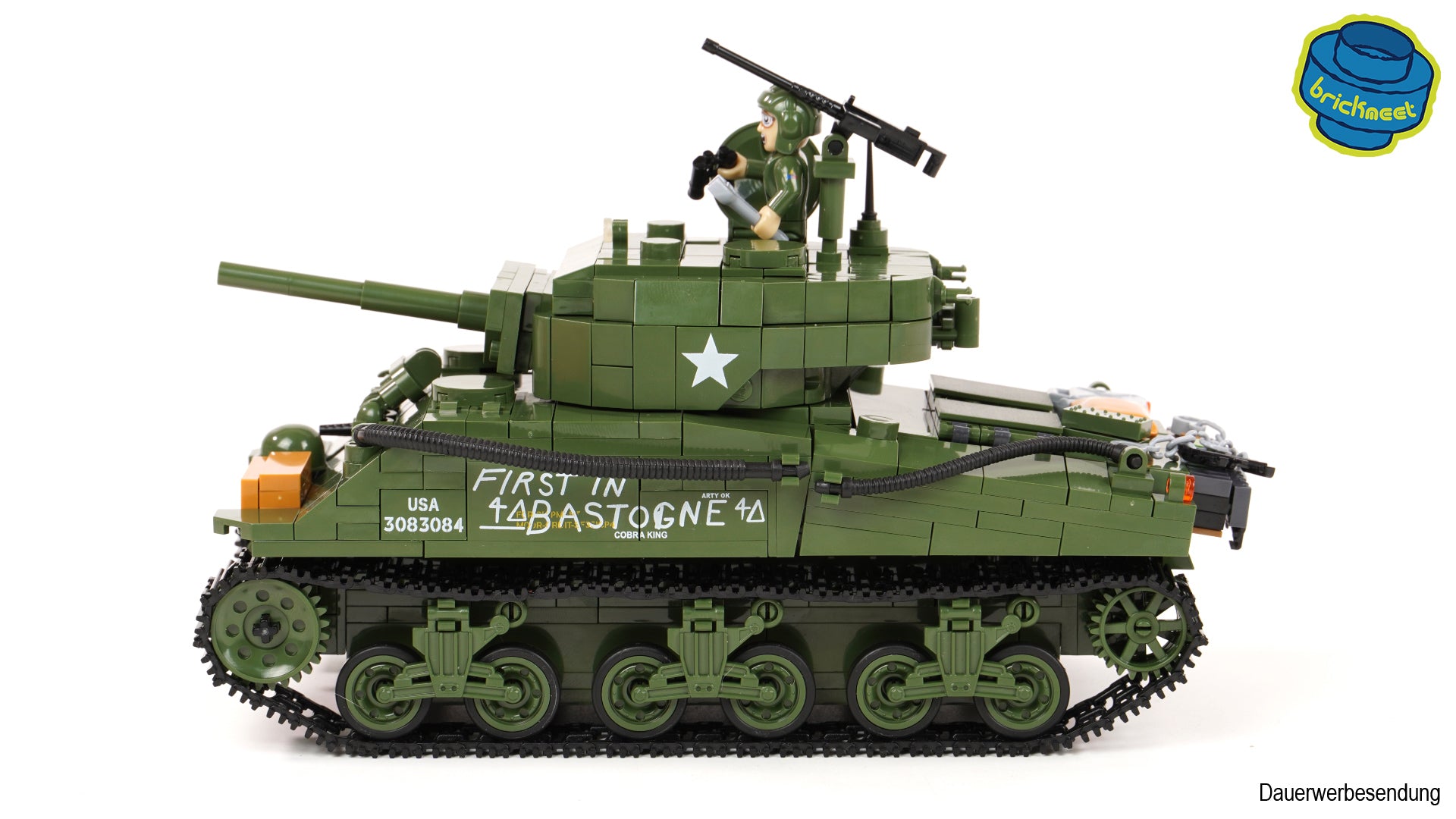 The Sherman M4A3E2 "Jumbo" is a short series of well-armored tanks consisting of just 254 tanks. The Shermans were armed with a 75mm gun mounted on a modified M62 mount. The jumbo with its own name "Cobra King" was the one to receive the 76mm gun as well as the coaxial machine gun. It was issued to the 37th Tank Battalion, 4th Panzer Division at the end of October 1944 and was the tank of the commander of the C comrades. The tank became famous during the German offensive in the winter of 1944 in the Ardennes. It was the first to break through the German lines and reach the soldiers of the 101st Airborne Division surrounded in Belgian Bastogne. To commemorate this momentous event, the tank's crew painted a special graffiti, which was reproduced by the COBI with pad-printing. Some sources say that the tank took part in Operation Hammelburg, General Patton's secret mission, where it was destroyed in March 1945. For many years, the wreckage of the tank was exhibited on war memorials under incorrect markings. It was not until 2001 that military chaplain Keith Goode contributed to the uncovering of the true history of the anonymous wreckage. The tank has been painstakingly restored at The Patton Museum and is now located in Fort Benning, Georgia. In the Belgian Bastogne, however, a properly painted replacement for the famous Sherman "King Cobra" was installed.