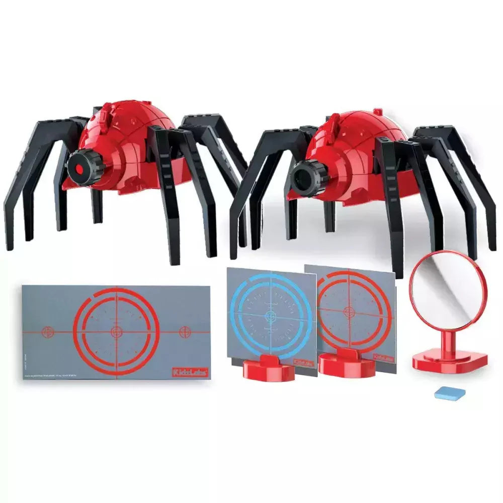 - Children build a challenging light beam maze using the spider-shaped emitter, receiver sensor, and reflective mirrors, developing spatial reasoning and agility as they navigate without interrupting the beam.