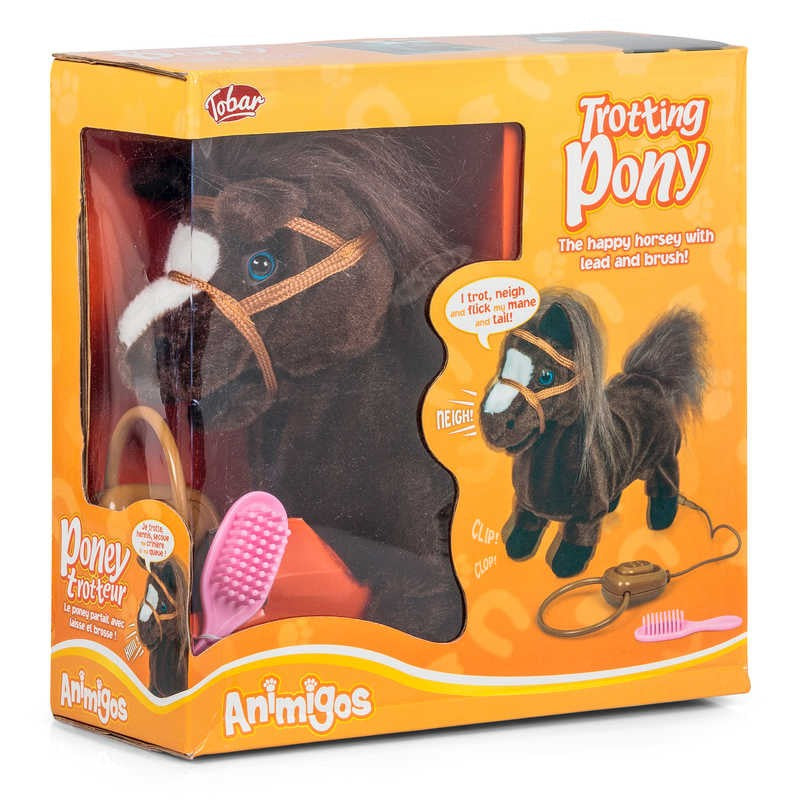 Plush pony toy with a range of animated features. Push the button on his long lead rein and this little pony will trot forward or pauses to neigh whilst shaking his thick mane and tail. It has a lovely, shiny coat and comes with a pink brush for grooming. Part of the Animigos range.