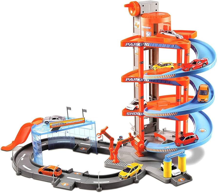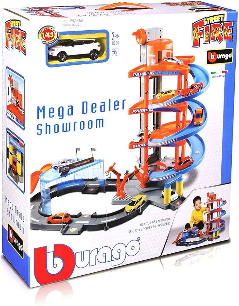 Four storey Mega Dealer Showroom play set. 1:43 size toy cars can be hoisted between the floors via the lift and rolled down the twisting ramp that connects the floors. Ground floor features a car wash, small road network and clear plastic showroom with roof access ramp. Includes two 1:43 scale cars from the Street Fire range.