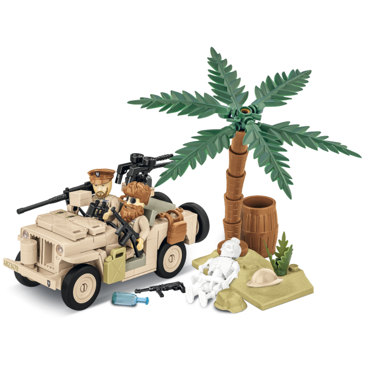 This licensed Willys Jeep was released in the British SAS unit paint scheme. The world's most popular off-road vehicle from the Second World War was designed in 1:35 scale and consists of 180 elements. The presented model differs significantly from those used by the US Army. The extremely characteristic cut-out grill of the vehicle with the condenser is very striking. Such a modification of the stock Jeep allowed it to operate in difficult desert conditions, where it is very easy to overheat! Sand paint and items necessary for survival in the desert placed on the hood and bed distinguish the vehicle and add to its appearance of fighting in Africa. The set includes a skeleton lying under a desert palm tree. Around it there are interesting accessories: helmets, weapons and a bottle.