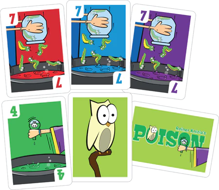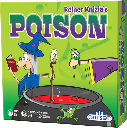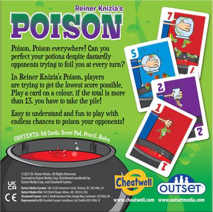 Can you perfect your potion and create the ultimate poison? Players are trying to get the lowest score possible. Play a card on a colour, if the total is more than 13, you have to take the pile! At the end of round, each card is worth 1 point, but each Poison card is worth 2 points. The person with the least amount of points wins! This competitive game of sabotage is easy to understand and fun to play with endless chances to poison your opponents! Poison is a fun card game by world-renowned games inventor Reiner Knizia.