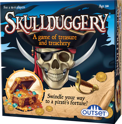 Avast, ye me hearties, it’s time to divide the plundered booty in this cunning card game of treasure and treachery. Will you make off with your fair share of the doubloons or will you be double-crossed by your sneaky shipmates? Swap and switch the spoils as you swindle your way to acquiring the most loot! Give no quarter as you use the Skullduggery tokens to hoodwink yer mateys and ransack their riches. It’s the game of piratical pilfering that separates the seasoned sea dogs from the listless landlubbers! Aaaarrrrgggghhhh!