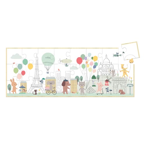 This 24-piece wooden puzzle, featuring animals around iconic Parisian landmarks, is designed to engage children in developing their observation, concentration, and fine motor skills while enjoying a playful experience.